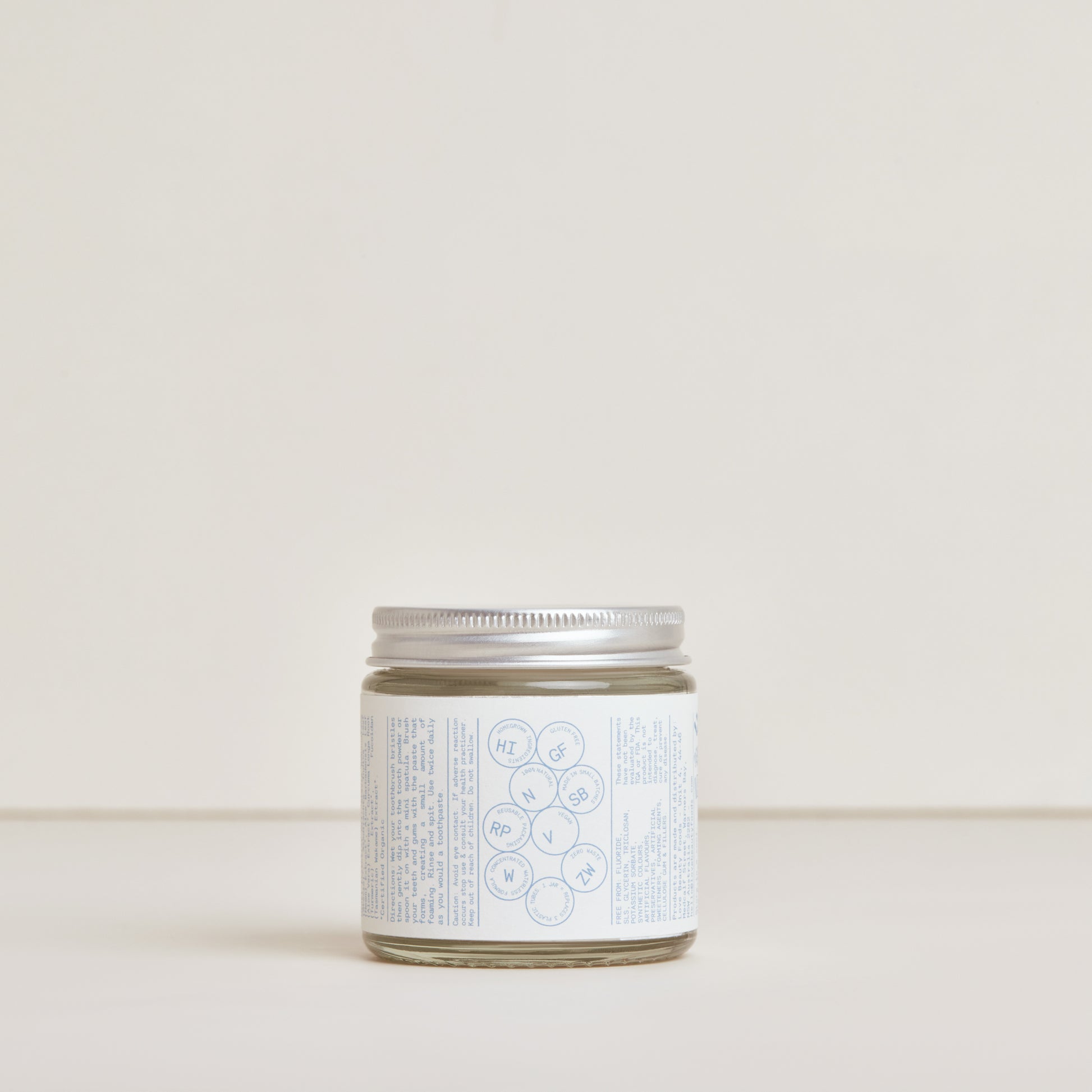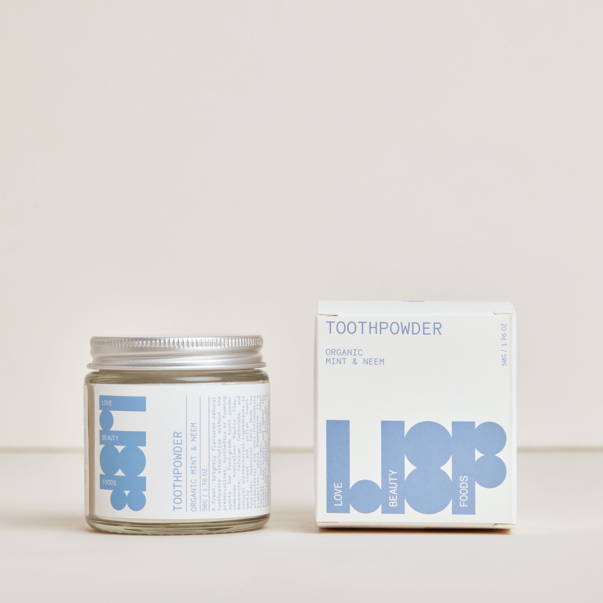 A fresh, brightly flavoured natural toothpaste alternative without the fluoride, preservatives, synthetics or foaming agents. Our food-grade tooth powder combines Australian Kaolin Clay, Bentonite, Calcium Carbonate and natural antibacterial ingredients to gently clean and polish teeth. While also helping remove plaque, remineralise the enamel and detoxify the mouth. Ayurvedic medicinal herb Neem has antibacterial and anti-inflammatory properties to boost the oral immune response, while steam-distilled organic peppermint and bush balm mint oils are antifungal, preventing bad breath and making the powder taste amazing. Each jar of water-free formula prevents 3 toothpaste tubes going to landfill.